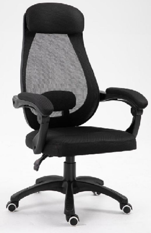 Ergonomic mesh office chair designed for comfort and durability, featuring PU castors for smooth mobility and a 350mm nylon base for stable support. Equipped with a 100mm painted gas lift for height adjustment and a multi-function mechanism for tilt, lock, and rocking control. Chair includes recliner armrests with mesh padding and is upholstered in breathable black mesh fabric.
